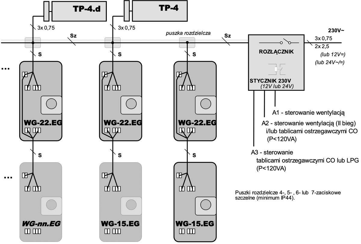 Cyfrowe detektory gazów typu WG.EG są urządzeniami przeznaczonymi do ciągłej kontroli nadmiaru spalin samochodowych oraz obecności gazów wybuchowych w garażach zamkniętych.
