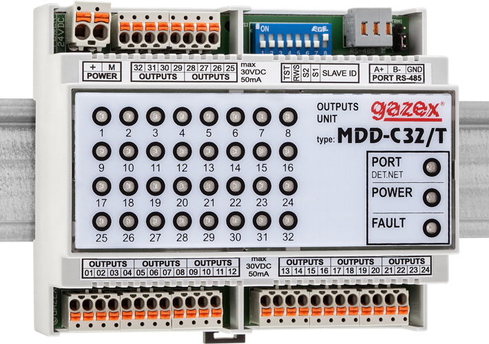 - 32 low-voltage OC outputs controlling external relays (e.g. RM type);